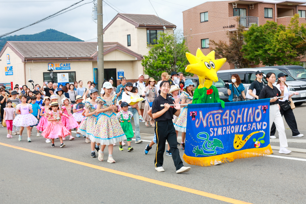 富士山河口湖音楽祭では、特定のホールだけで演奏される訳ではなく、町の各所で様々な演奏会が行われます。取材に伺った日は、近くに合宿に来ていた習志野高校の学生たちが、一般道をパレードする姿も。