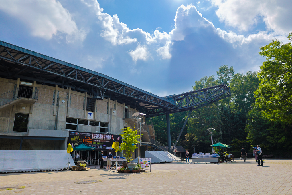 富士山を望む自然豊かな環境に位置し、開閉式の屋根を備えたこの劇場は、古代ローマ劇場に似た半円形ですり鉢状の客席があるオープンな会場です。